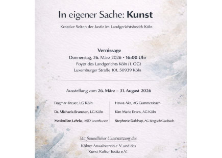 Unser Verein, 1998 als Verein zur Förderung kultureller Zwecke im Bereich der Kölner Justiz gegründet und seit 2000 in Kunst Kultur Justiz e.V. (kurz KKJ) umbenannt, hat sich zum Ziel gesetzt, Kunst und Kultur in den Justizgebäuden im Oberlandesgerichtsbezirk Köln zu fördern. weiterlesen